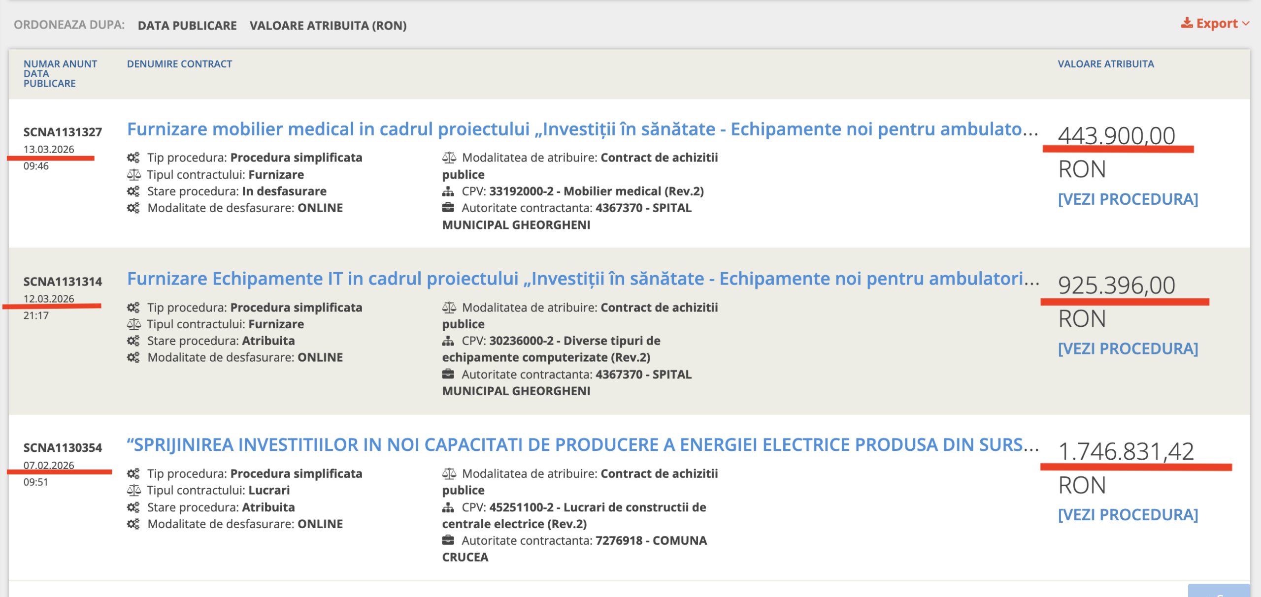 - 13 martie 2026: un contract de 443.900 de lei, pentru mobilier medical (procedură aflată în desfășurare) tot pentru Spitalul Municipal Gheorgheni tot din Harghita