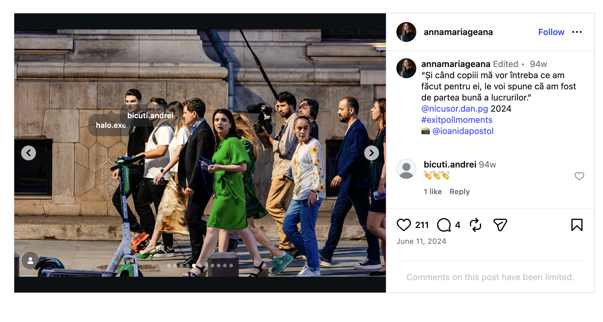 În fotografii, alături de Nicușor Dan, apar Diana Iancu/ fostă Lazăr, Mihai Cojocaru, Andrei Bicuți, consiliera Ana Maria Geană și Matei Păun, la momentul exit pollurilor din 9 iunie 2024, când actualul președinte a câștigat al doilea mandat de primar al Bucureștiului.
