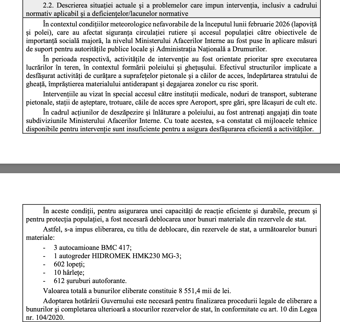 Bunurile sunte destinate salvatorilor. Este vorba despre trei camioane, un autogreder, 602 lopeți, 20 hârlețe și 612 șuruburi autoforante. Conform notei informative a proiectului, decizia este luată urmare a ninsorilor abundente din luna februarie.