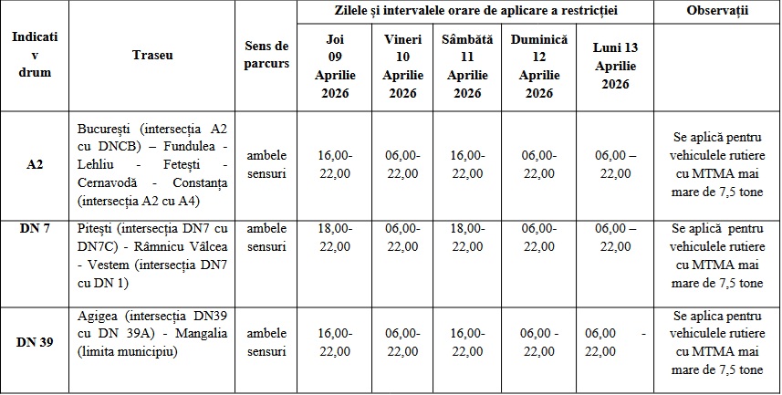 Circulația acestor vehicule este interzisă în zilele de joi 9 Aprilie (ziua premergătoare zilei de sărbătoare legală), 10 Aprilie (Vinerea Mare), 11 Aprilie (ziua premergătoare zilei de sărbătoare legală), 12 și 13 Aprilie (prima și a doua zi de Paste) 2026 pe anumite tronsoane de drumuri.