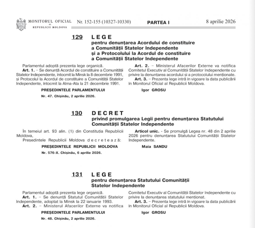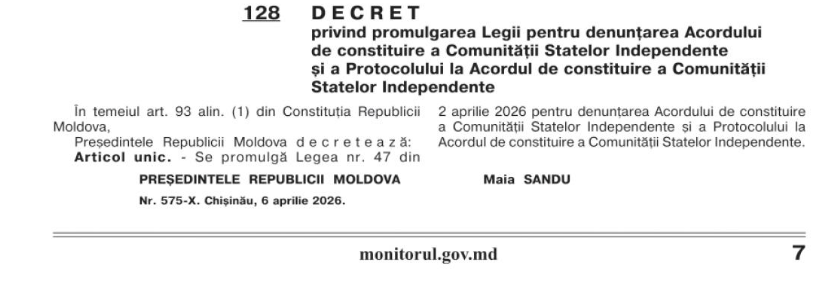 Deciziile de denunțare de către Republica Moldova a Acordului de constituie, a protocolului aferent și a statutului Comunității Statelor Independente (CSI)  au fost promulgate de Maia Sandu și publicate în Monitorul Oficial. Statele membre ale organizației urmează să fie notificate despre hotărârea autorităților de la Chișinău.