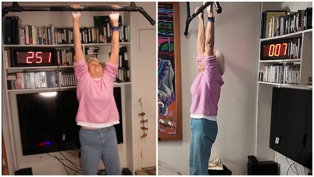 A 90-year-old grandmother has entered the Guinness World Records after hanging from a pull-up bar for nearly three minutes