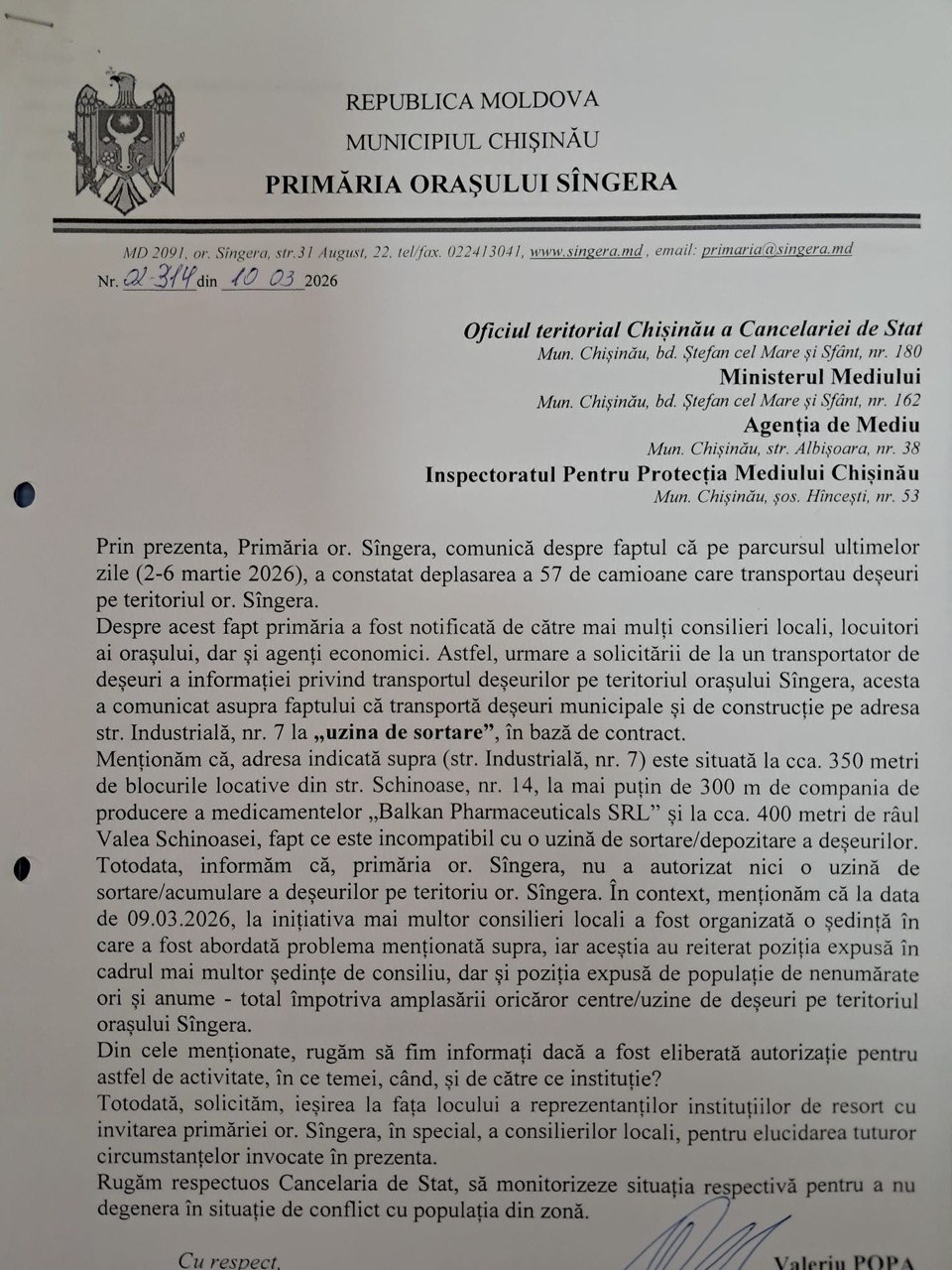 În scrisoare este menționat că stația de sortare a deșeurilor se află la doar 350 de metri de blocuri de locuit, 300 de metri de o companie farmaceutică și 400 de metri de râul Valea Schinoasei. Primarul mai anunță că nu au eliberat autorizație pentru această companie, iar consiliul local este împotriva amplasării unei astfel de uzine pe teritoriului orașului Sîngera.