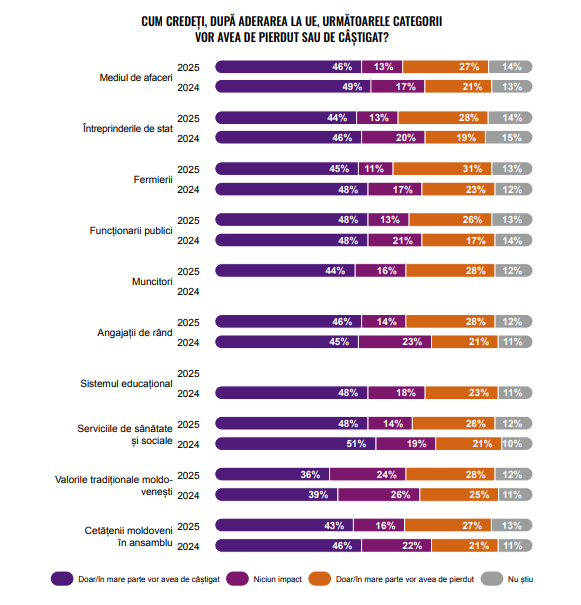 Aproximativ jumătate dintre moldoveni cred că aderarea la UE va aduce beneficii diverselor grupuri sociale, inclusiv pentru cetățeni în general, fermieri, angajați, afaceri private și întreprinderi de stat. În același timp, aproximativ 30% presupun că aceste grupuri vor avea de suferit din cauza aderării, în timp ce alte 10-15% nu se așteaptă la nicio schimbare. Sunt datele Raportului privind Indexul Rezilienței Informaționale Naționale (IRIN), realizat de Centrul pentru Comunicare Strategică și Contracarare a Dezinformării.