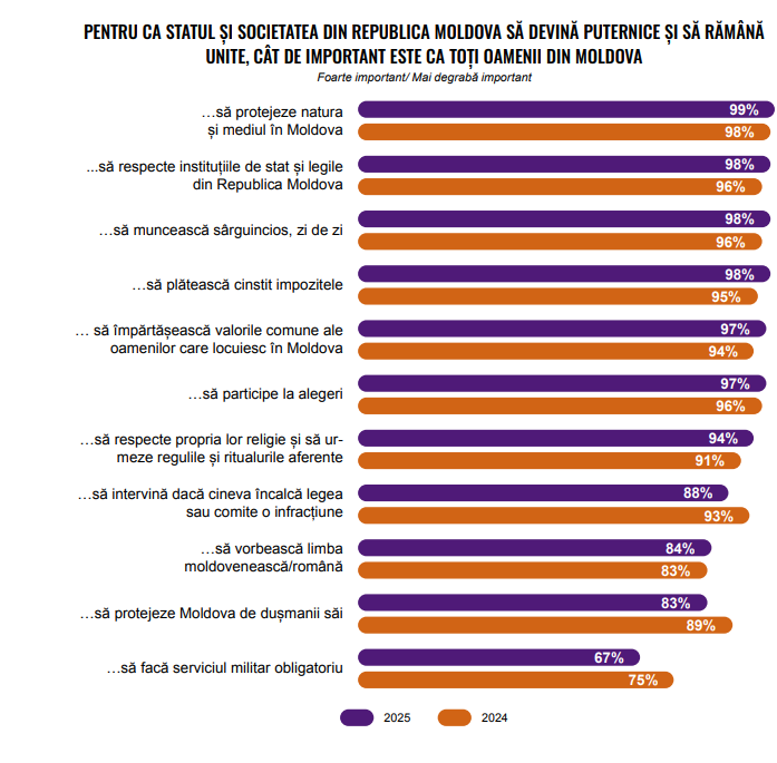 Astfel, potrivit raportului pentru anii 2024–2025, majoritatea covârșitoare a moldovenilor consideră că un stat puternic se bazează pe valori precum protejarea mediului, respectarea legilor, plata impozitelor și munca zilnică. Aceste principii rămân aproape unanim susținute în 2024 și în 2025.