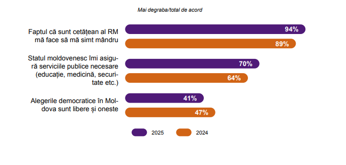 Unul dintre cele mai pozitive semnale este creșterea mândriei naționale: 94% dintre cetățeni au declarat în 2025 că sunt mândri că sunt moldoveni, în creștere față de 89% în 2024. În paralel, percepția privind securitatea personală și capacitatea statului de a oferi servicii publice s-a îmbunătățit.