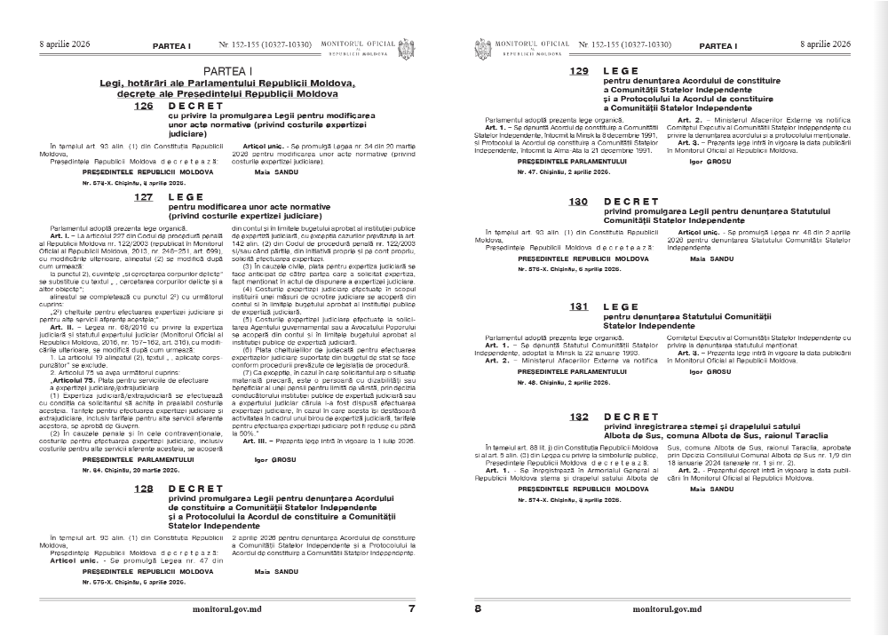 De astăzi, 8 aprilie 2026, au intrat în vigoare denunțările Acordului de constituire a Comunității Statelor Independente (CSI), ale Protocolului aferent și ale Statutului CSI, după promulgarea legilor și publicarea acestora în Monitorul Oficial al Republicii Moldova.