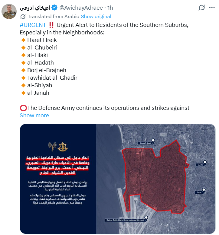 „Forțele de Apărare ale Israelului continuă să acționeze și să lovească infrastructura militară aparținând organizației teroriste Hezbollah în diverse zone din suburbiile sudice. IDF nu intenționează să vă facă rău și acționează doar împotriva agenților Hezbollah și a țintelor militare. Prin urmare, pentru siguranța dumneavoastră, trebuie să evacuați imediat”, a declarat purtătorul de cuvânt al armatei în limba arabă, Avichay Adraee, pe X.