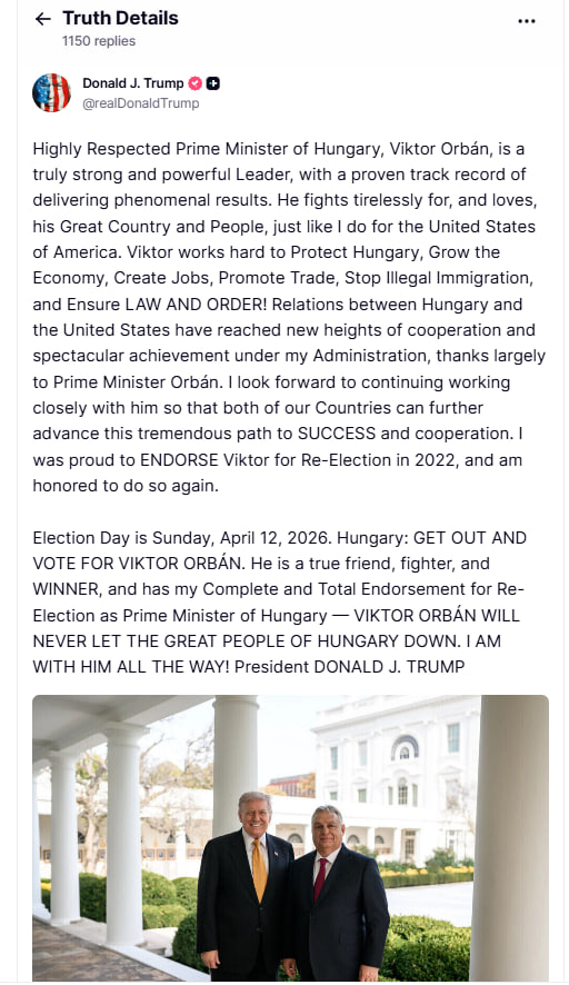 În ajunul alegerilor parlamentare din Ungaria, programate pentru duminică, 12 aprilie, președintele Statelor Unite, Donald Trump, și-a exprimat din nou sprijinul pentru premierul ungar Viktor Orban, îndemnând cetățenii să voteze pentru partidul său Fidesz.