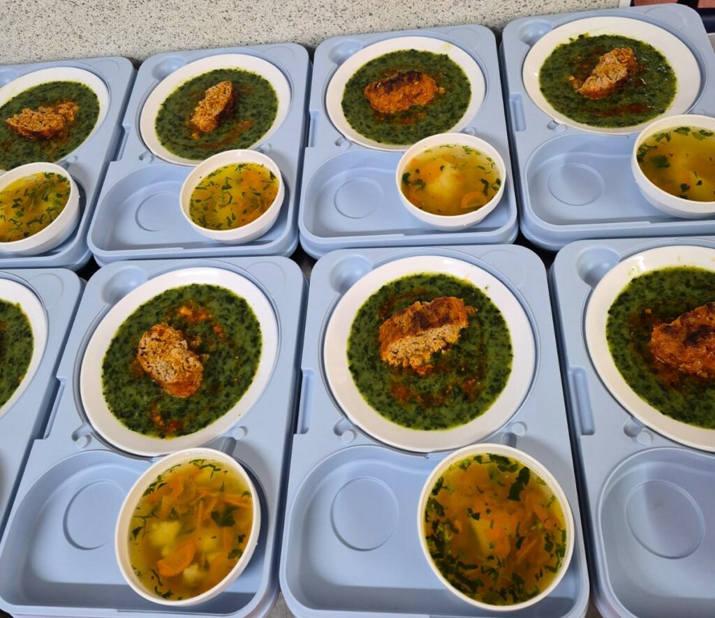 La prânz, meniul a inclus o supă de legume cu găluște, urmată de un preparat special pregătit pentru această ocazie: ruladă din pulpă de porc, în stil drob, servită alături de garnitură de spanac, adaptată cerințelor nutriționale ale pacienților.