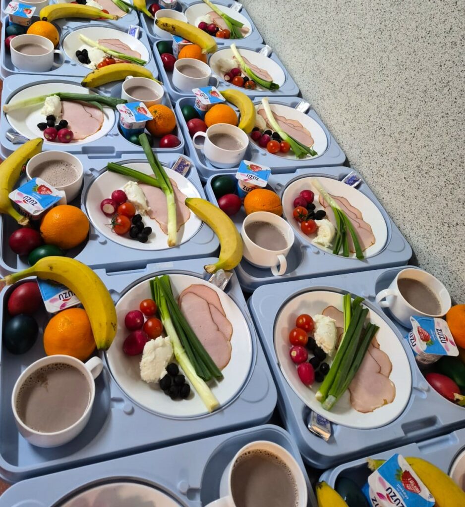 În ziua de Paște, pacienții au început dimineața cu preparate tradiționale specifice, precum ouă roșii, alături de cașcaval, mușchi file, unt proaspăt, pâine, ridichi și ceapă verde. Micul dejun a fost completat de cacao cu lapte și cozonac, pentru a reda gustul autentic al sărbătorii.
