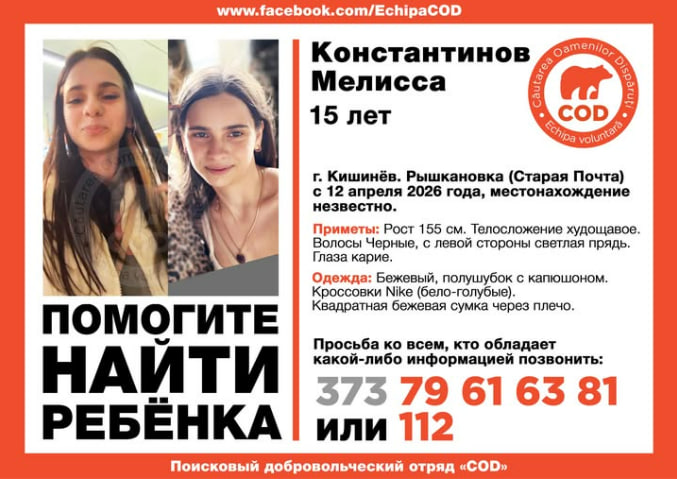 O adolescentă de 15 ani, identificată ca Melisa Constantinov, este căutată după ce a dispărut în ziua de Paști, pe 12 aprilie 2026, în sectorul Râșcani al capitalei Chișinău, zona Poșta Veche. Anunțul a fost făcut de echipa de căutare COD, care solicită sprijinul cetățenilor pentru identificarea locului în care se află minora.