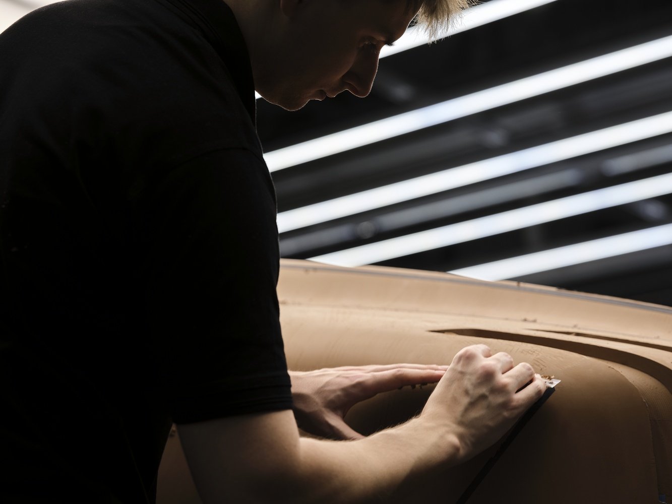 O singură linie a carenei rulează continuu de-a lungul modelului, inspirată de linia care separă carena unui iaht de suprastructura sa. Așezată intenționat sus, creează senzația de a fi învăluit adânc în interiorul automobilului. Un volum curbat în spatele tetierelor se ridică ca un guler întors, protejând șoferul și companionul.