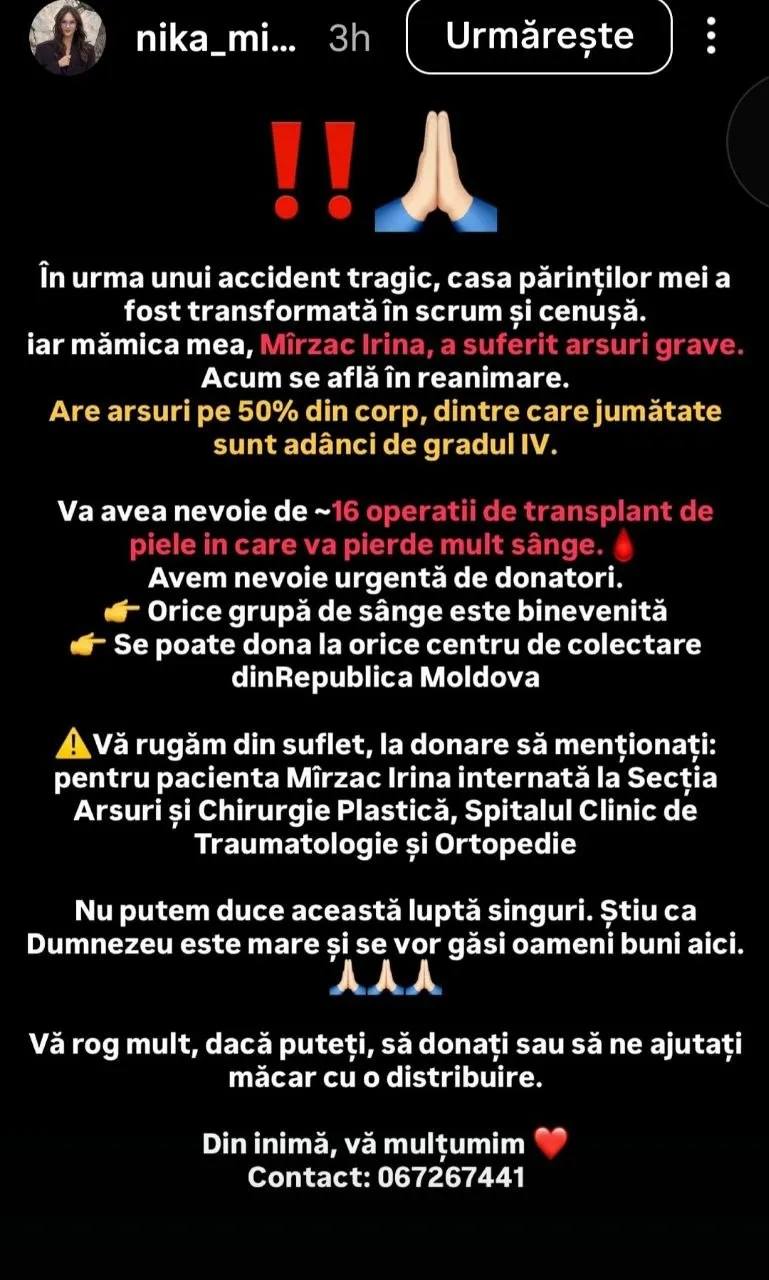 Pacienta va avea nevoie de aproximativ 16 operații de transplant de piele, în cadrul cărora va pierde mult sânge. Fiica acesteia, Nicoleta Mîrzac, a lansat un apel urgent pentru donatori de sânge, precizând că este acceptată orice grupă.