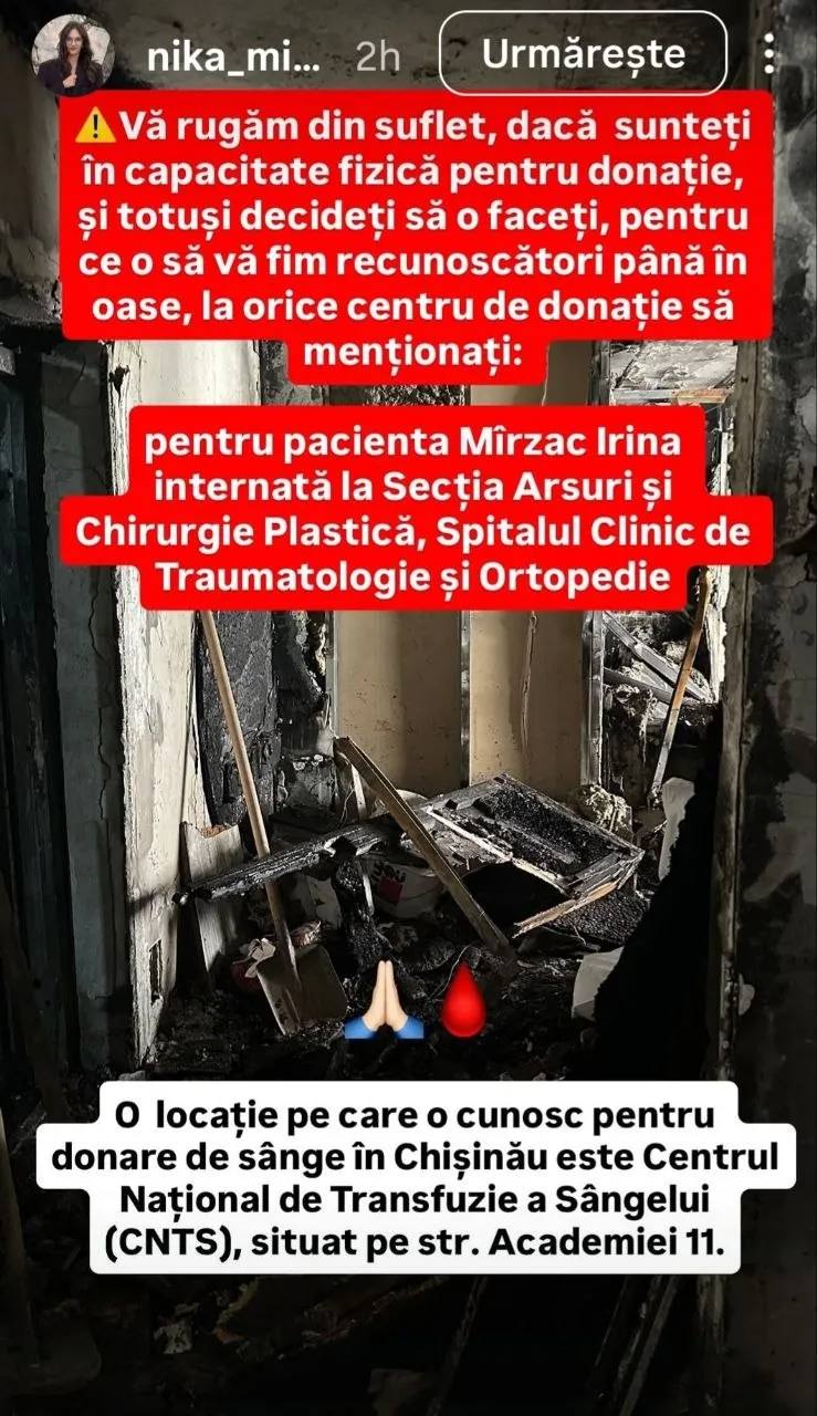 Femeia care a suferit arsuri în urma incendiului izbucnit pe 14 aprilie într-un apartament de pe strada Sprîncenoaia, din sectorul Telecentru al Capitalei are nevoie urgentă de transfuzie de sânge. Mîrzac Irina are arsuri pe 50% din corp, dintre care jumătate sunt de gradul IV, și se află în reanimare.