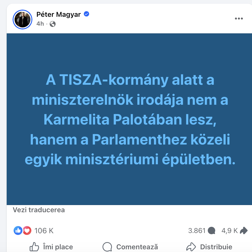 Sub guvernul TISZA, biroul prim-ministrului nu va fi în Palatul Carmelit, ci într-o clădire ministerială aproape de Parlament, a scris Péter Magyar astăzi, pe pagina sa de Facebook.