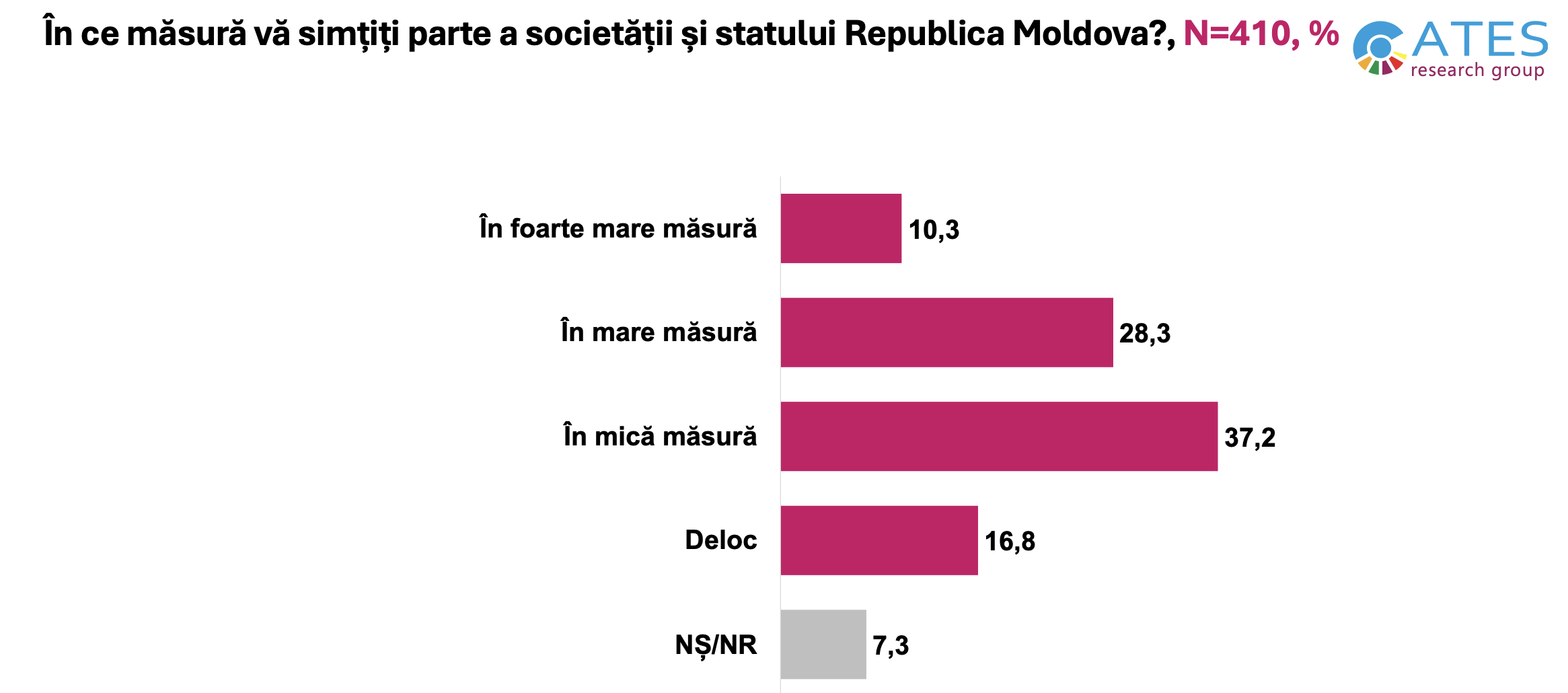 Sondajul mai arată că aproape 17% dintre găgăuzi nu se simt parte a Republicii Moldova. La polul opus, peste 10% dintre ei se simt în foarte mare măsură parte a societății. Alte 28,3% spun că sunt în mare măsură parte a Moldovei, iar 37,2% – în mică măsură.