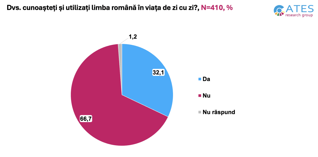 Potrivit studiului, doar circa 32,1% dintre localnici știu și utilizează zilnic româna. În același timp, 1,2% preferă să nu răspundă, fiind întrebați dacă știu limba de stat.
