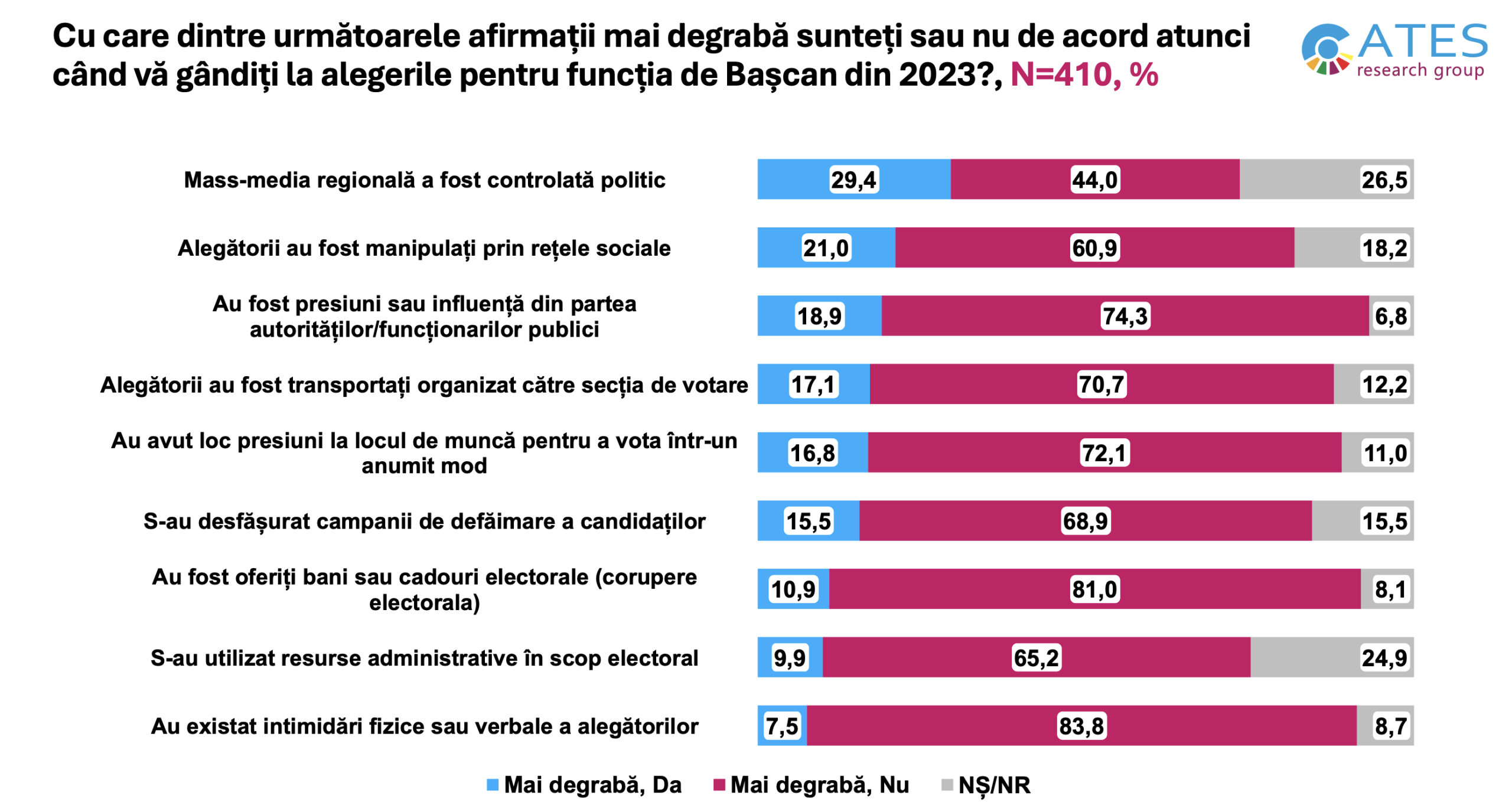 Studiul a fost realizat de ATES Research Group în perioada 14–18 martie 2026, pe un eșantion reprezentativ de 410 respondenți din 20 de localități urbane și rurale din UTA Găgăuzia. Respondenții au peste 18 ani. Marja de eroare constituie ±4%.