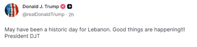 Într-o altă postare, liderul american a numit ziua întâlnirii dintre liderii celor două state din Orientul Mijlociu „o zi istorică pentru Liban”.