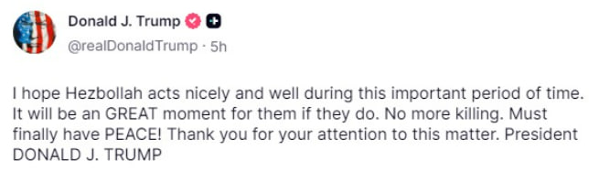 „Sper că Hezbollah se va comporta bine și conștiincios în această perioadă crucială. Va fi un moment măreț pentru ei dacă vor face asta. Gata cu crimele. În sfârșit trebuie să fie pace!”, a afirmat Trump.