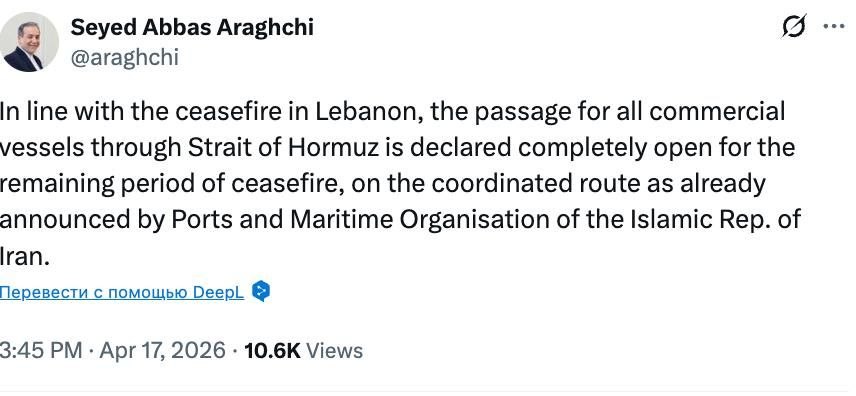 Ministrul de Externe al Iranului, Abbas Araghchi, a anunțat că, în conformitate cu armistițiul din Liban, trecerea tuturor navelor comerciale prin Strâmtoarea Ormuz este declarată complet deschisă pe durata perioadei rămase a încetării focului, în data de 17 aprilie.