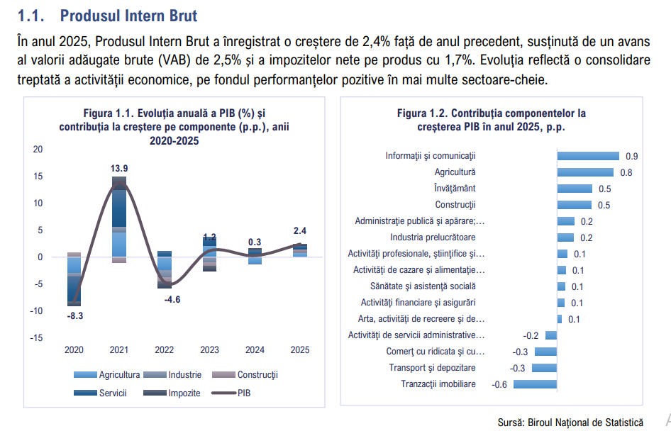 În general, potrivit ministerului, economia Republicii Moldova în 2025 a înregistrat o creștere moderată, în timp ce dezechilibrele în comerțul exterior și sistemul financiar au crescut. PIB-ul țării a crescut cu 2,4%.