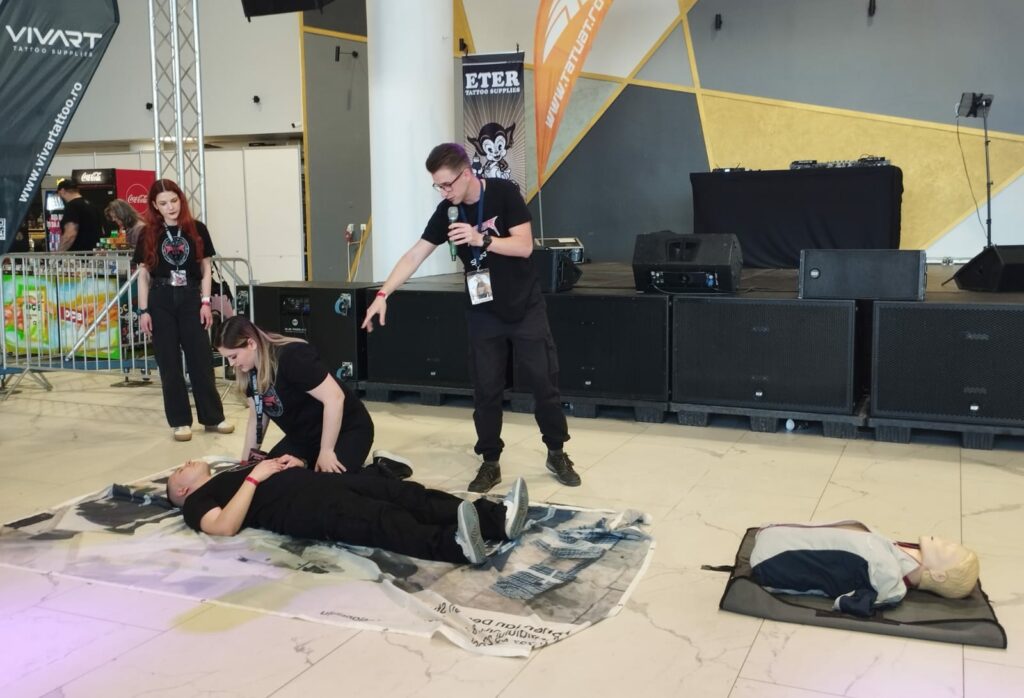 Cursul de prim ajutor a fost realizat, sâmbătă, de medicii rezidenți ATI de la Spitalul Județean de Urgență „Pius Brînzeu” din Timișoara, în cadrul festivalului Timișoara International Tattoo Convention.
