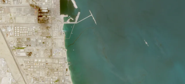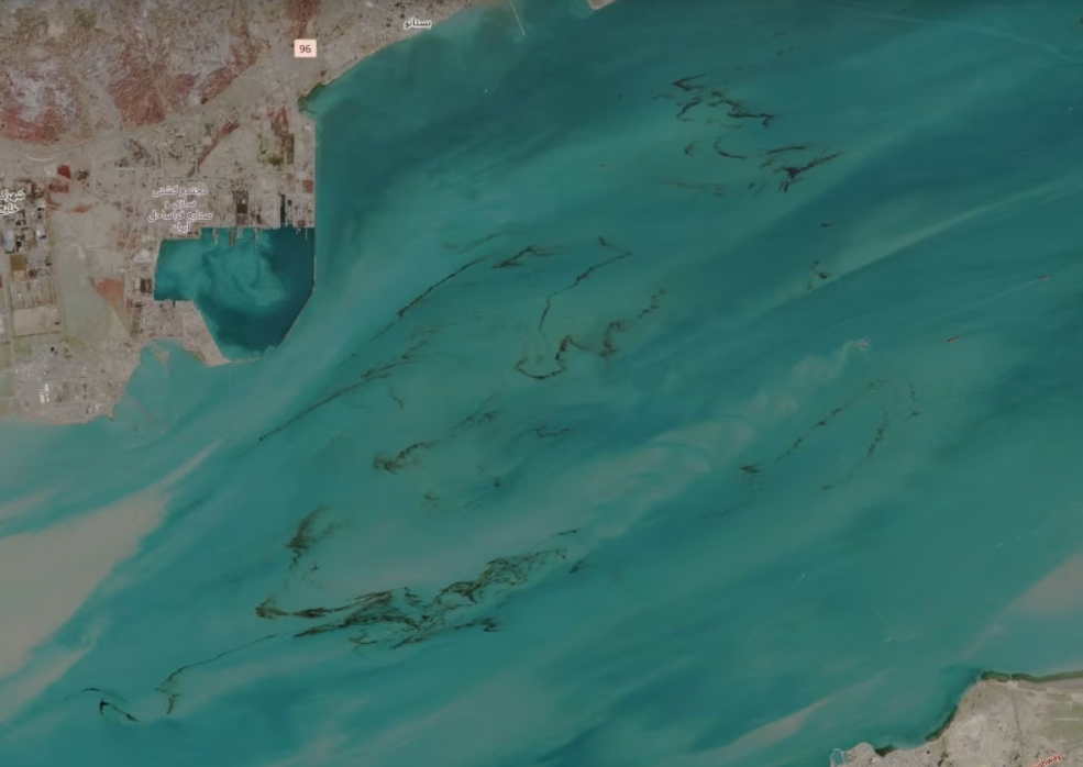 Una dintre imaginile realizată în ultimele săptămâni arată o pată de petrol de peste opt kilometri lungime în Strâmtoarea Ormuz, în apropiere de insula iraniană Qeshm. Potrivit Ninei Noelle, purtătoare de cuvânt a Greenpeace Germania, petrolul ar proveni de la nava iraniană Shahid Bagheri, avariată în aceeași zonă după un atac al forțelor americane din 28 februarie.