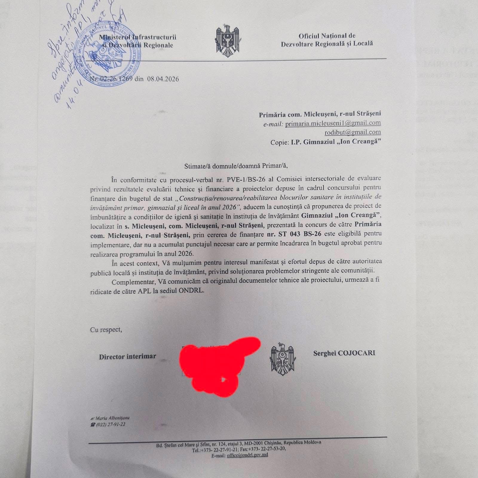 Informația apare într-o scrisoare oficială transmisă Primăriei Micleușeni de către Oficiul Național de Dezvoltare Regională și Locală, în care se precizează că proiectul este eligibil, dar nu a acumulat punctajul necesar pentru a fi inclus în bugetul aprobat.