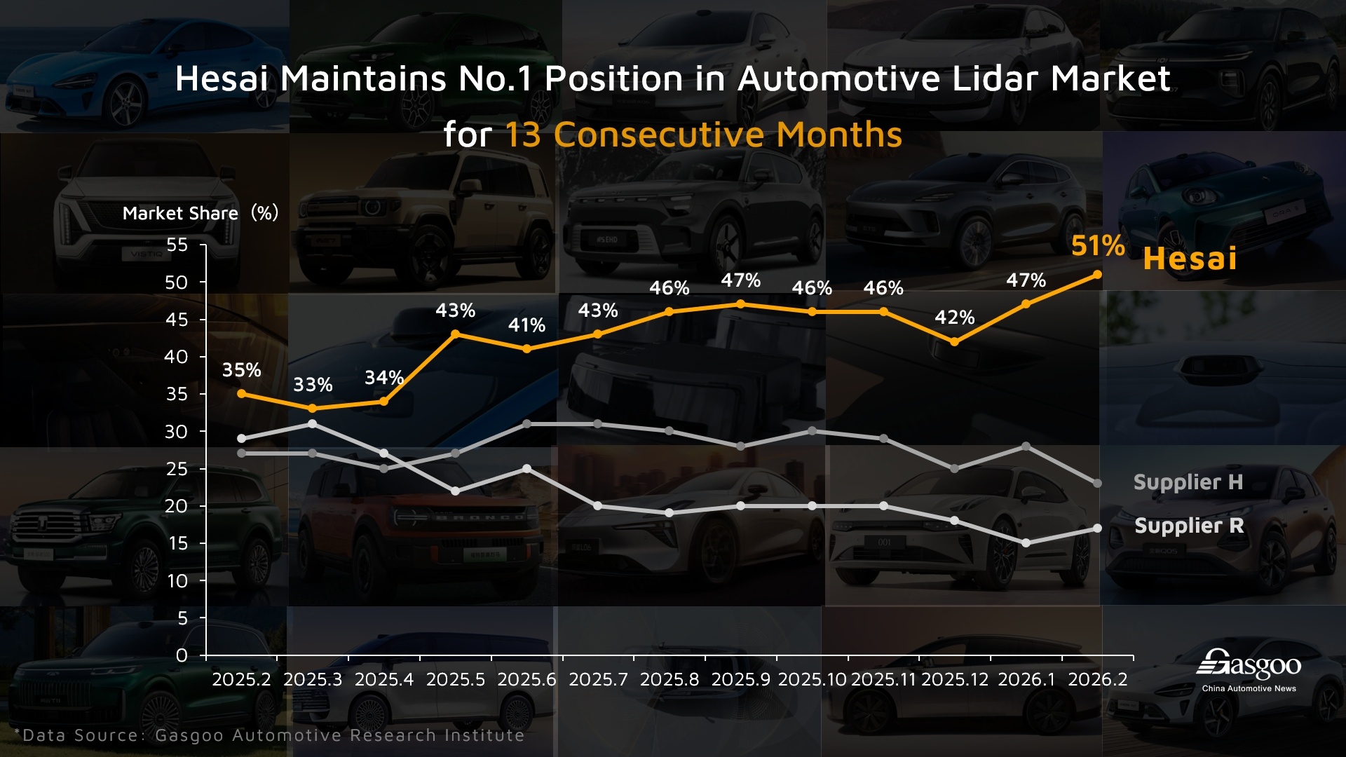 Conform Gasgoo Research Institute, Hesai a deținut peste 40% cotă de piață în 2025, clasându-se pe primul loc în industrie, și și-a menținut impulsul puternic în 2026, atingând o cotă de 51% în februarie, de 2.2 ori mai mare decât concurentul de pe locul secund și de peste trei ori mai mare decât cel de pe locul trei. Hesai și-a extins leadershipul pe piață la 13 luni consecutive.