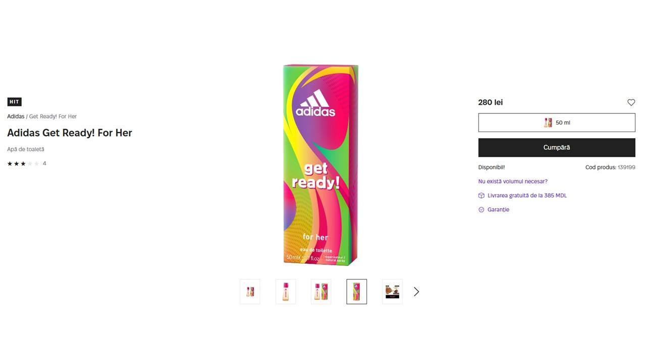 Detalii Produs Vizat: Marcă: Adidas; Denumire: Get Ready! (Parfum pentru corp/Body Fragrance pentru femei); Volum: 75 ml (capac roșu din plastic); Cod de bare: 3607349796402; Numerele de lot afectate: 0069, 9212, 9255. Deși în Europa s-a dispus distrugerea stocurilor, am constatat că acest produs (posibil din loturile vizate) este în continuare disponibil pentru comercializare pe platformele online din țara noastră”, transmite instituția.