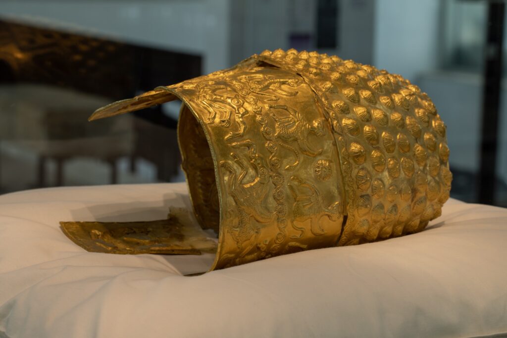 Muzeul Național de Istorie, despre Coiful de la Coțofenești: Expus în poziție orizontală pe o pernă specială, pentru protecție