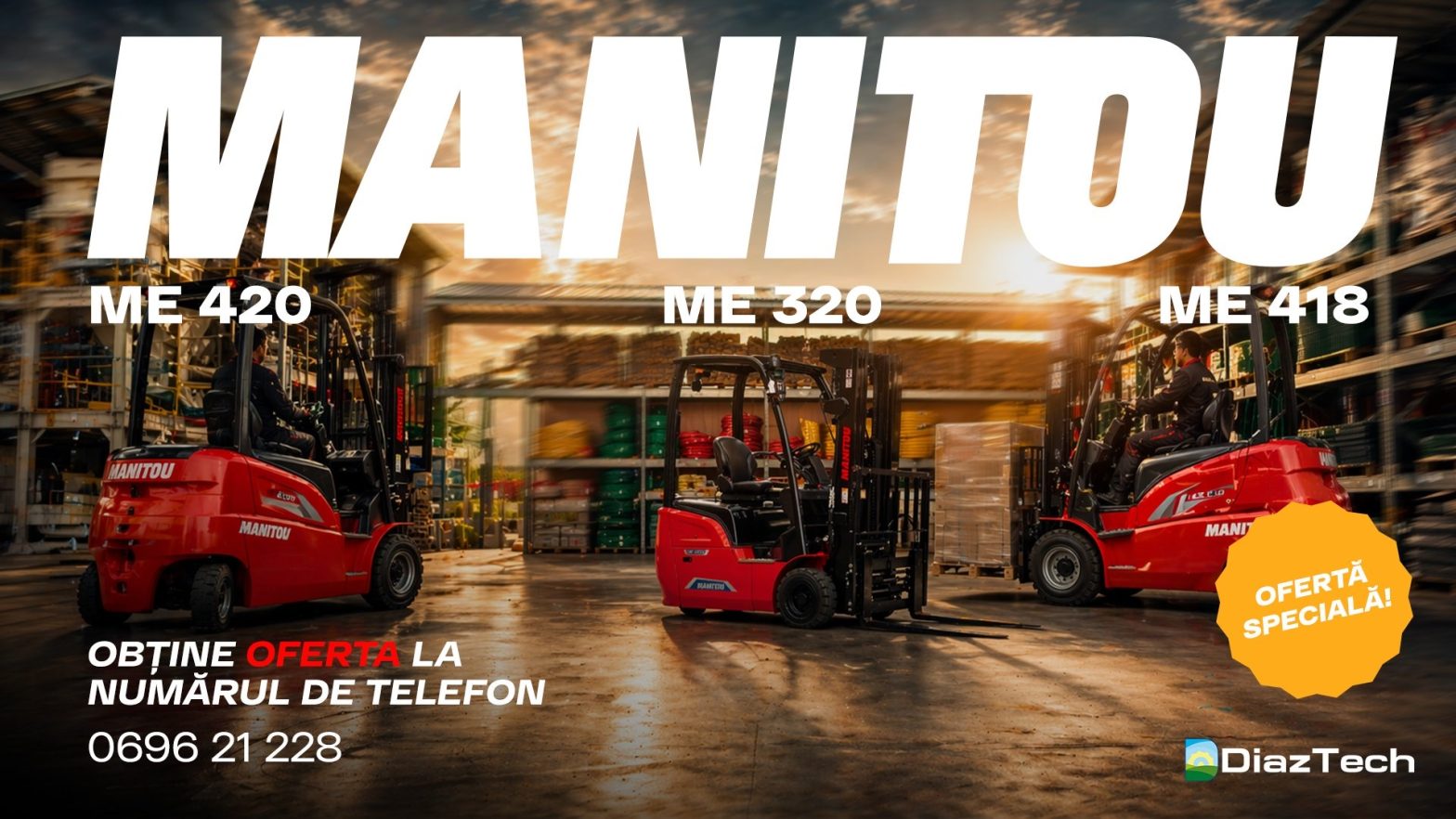 Diaztech anunță o ofertă specială pentru gama de stivuitoare electrice Manitou ME, disponibile acum în showroom și pregătite pentru livrare rapidă. Este ocazia perfectă pentru companiile care doresc să își eficientizeze operațiunile de depozitare cu utilaje performante, ecologice și economice.