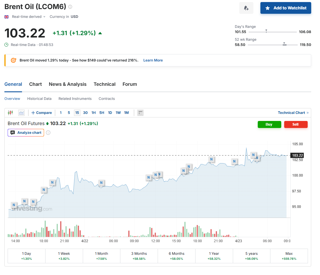 Potrivit datelor actuale din piață, cotația Brent a ajuns la aproximativ 103 dolari pe baril, în creștere cu peste 1% în ultimele ore.