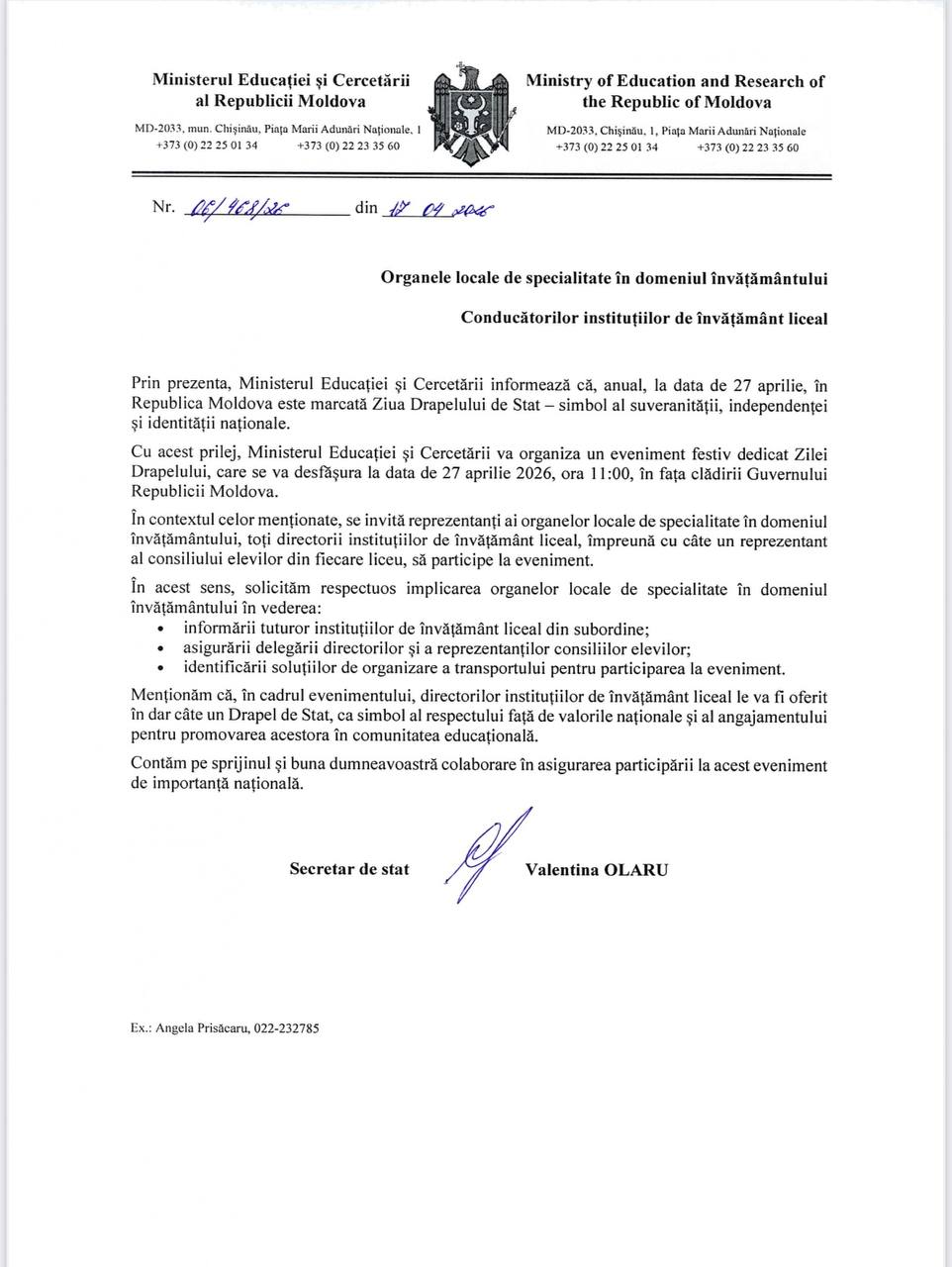 În document se solicită, de asemenea, informarea tuturor instituțiilor din subordine, delegarea participanților și identificarea soluțiilor de transport pentru deplasarea acestora la Chișinău.