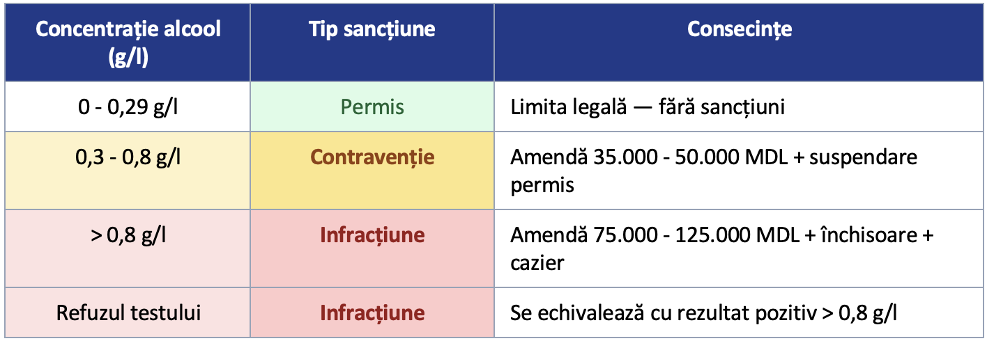 Legislația moldovenească stabilește mai multe praguri de concentrație a alcoolului în sânge (BAC – Blood Alcohol Concentration), fiecare cu sancțiuni specifice. Iată tabelul complet: