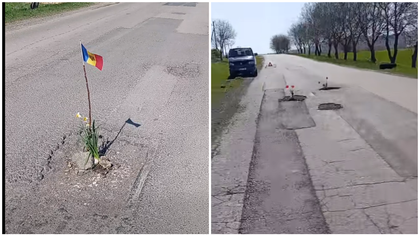 (stop cadru) Lalele și drapele în găurile din asfalt la Strășeni: „Dle Bolea, după ce ați rezolvat problemele din agricultură, ne oferiți și drumuri «de milioane»”