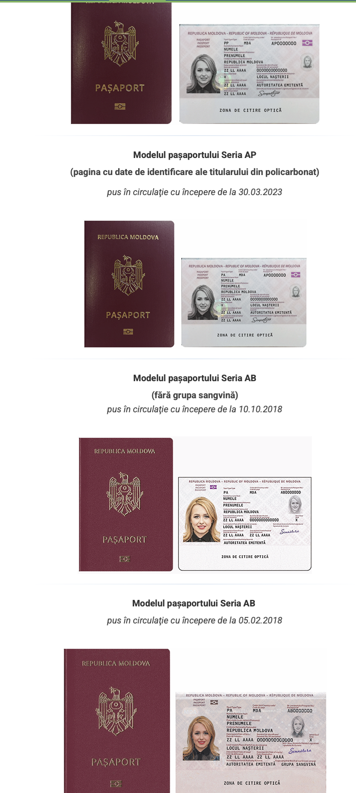 Conform informațiilor de pe site-ul oficial al Agenției Servicii Publice, actualmente în Republica Moldova există în circulație patru tipuri de pașapoarte: AB cu sau fără indicarea grupei sangvine și două modele de document din seria AP. Cele mai vechi acte sunt în circulație din mai 2018, iar cele mai recente – din ianuarie 2026.