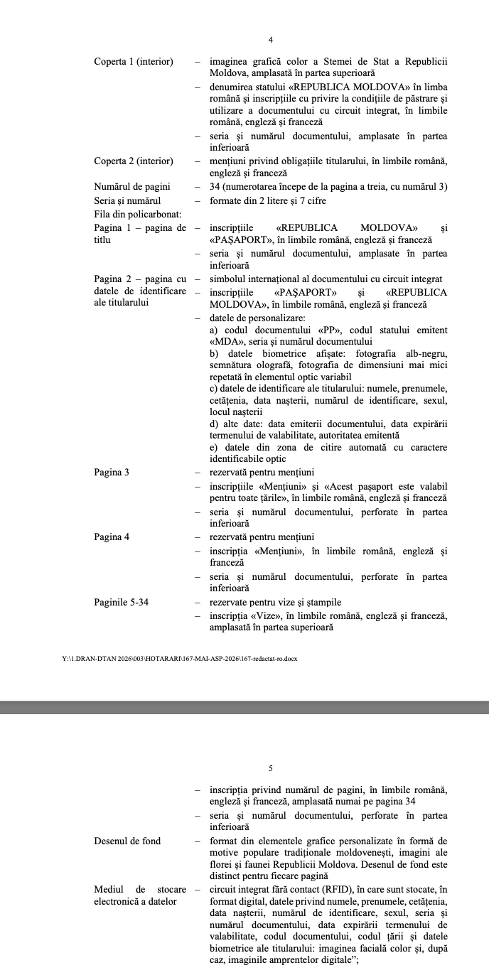 „Actualizarea periodică a modelelor de pașapoarte și de documente de călătorie în Republica Moldova este efectul evoluției continue a tendințelor tehnologice și de securitate la nivel mondial. (…) În contextul combaterii practicilor ce atentează la securitatea documentelor și integrării noilor tehnologii de protecție, ICAO (n. red.: Organizația Internațională a Aviației Civile) actualizează periodic cerințele și recomandările prevăzute de Documentul 9303. Respectiv, în scopul asigurării protecției datelor cu caracter personal ale titularilor și interoperabilității globale, Republica Moldova periodic asigură punerea în circulație a noilor modele de pașapoarte și documente de călătorie, îmbunătățite din punct de vedere a elementelor de securitate și de design, securizare a informației și măsuri de protecție a datelor cu caracter personal ale titularului”, se arată în nota informativă a proiectului.
