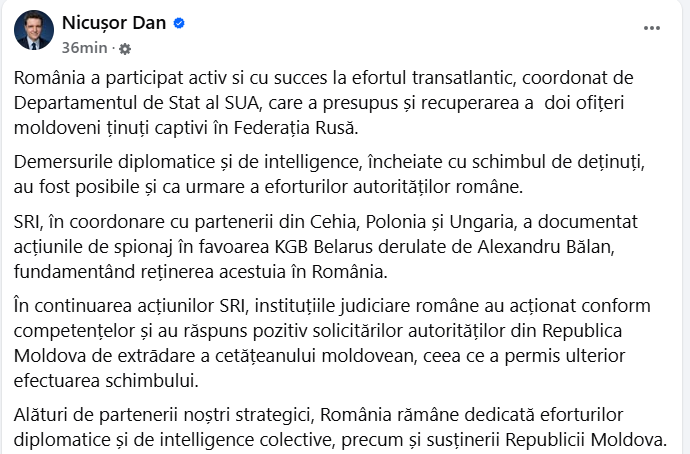 „În continuarea acțiunilor SRI, instituțiile judiciare române au acționat conform competențelor și au răspuns pozitiv solicitărilor autorităților din Republica Moldova de extrādare a cetățeanului moldovean, ceea ce a permis ulterior efectuarea schimbului. Alături de partenerii noștri strategici, România rămâne dedicată eforturilor diplomatice și de intelligence colective, precum și susținerii Republicii Moldova”, mai adaugă Nicușor Dan.