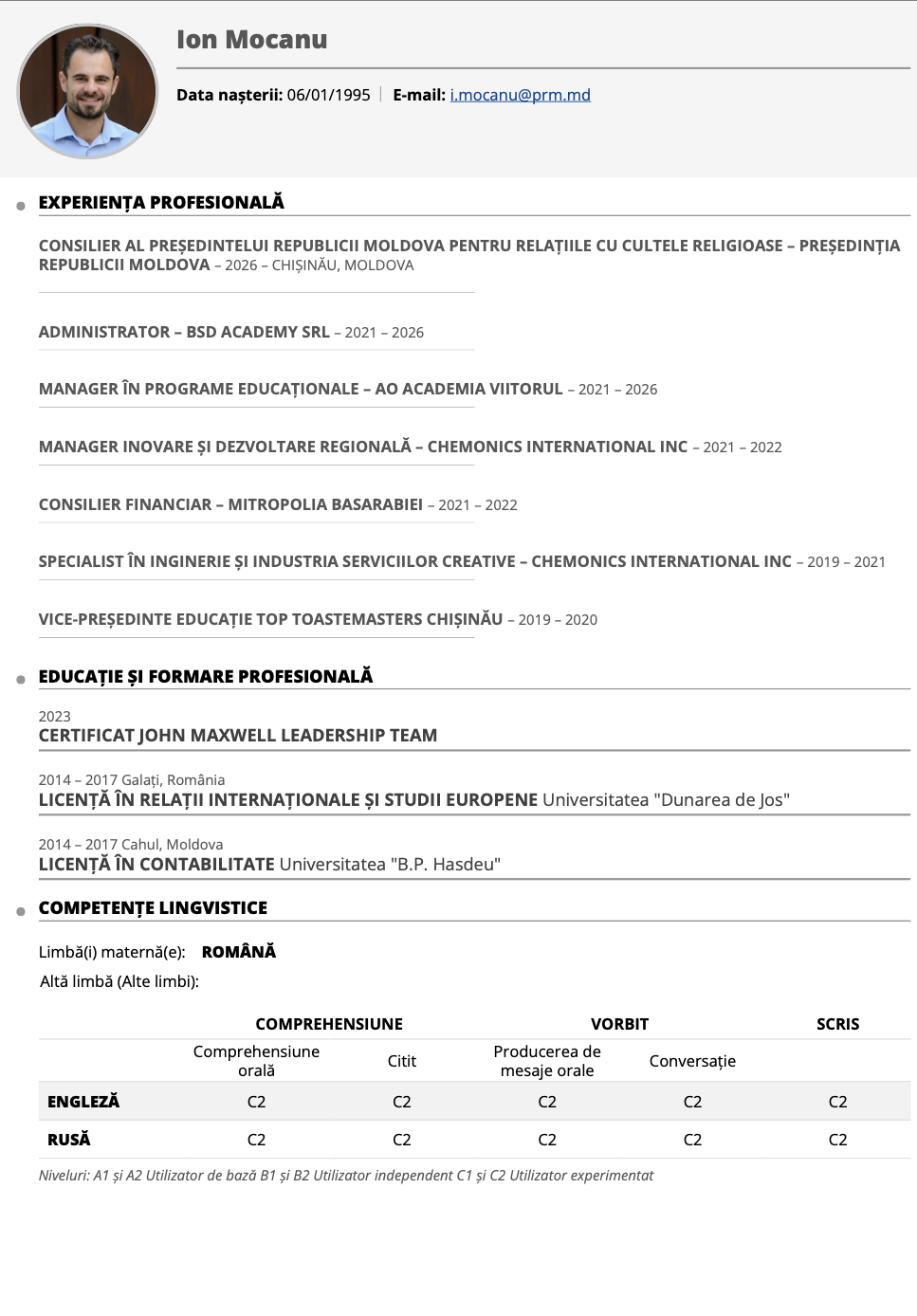 „Domnul Ion Mocanu are experiență în zona de consultanță pentru business, inovare și educație, precum și în managementul proiectelor. În acest context, a colaborat în trecut inclusiv cu Mitropolia Basarabiei, în calitate de consilier financiar. Este licențiat în Relații Internaționale și Studii Europene și în Contabilitate, având totodată certificări în leadership, coaching și mentorat.