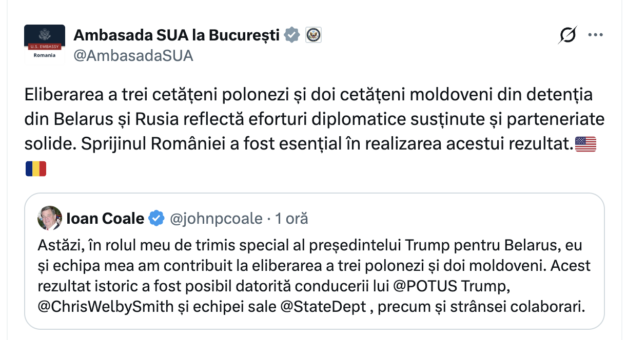 Eliberarea a trei cetățeni polonezi și doi cetățeni moldoveni din detenția din Belarus și Rusia reflectă eforturi diplomatice susținute și parteneriate solide. Sprijinul României a fost esențial în realizarea acestui rezultat„, scrie ambasada SUA la București, condusă de Darryl Nirenberg.