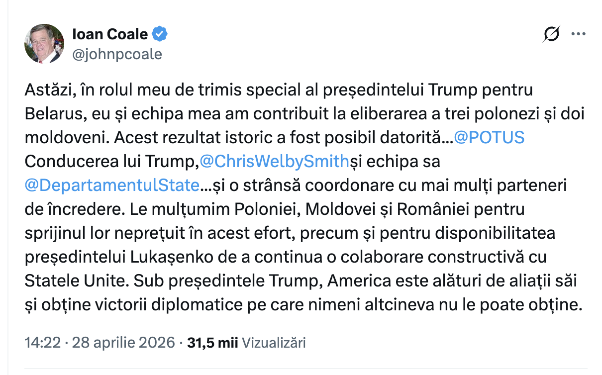 „Astăzi, în rolul meu de trimis special al președintelui Trump pentru Belarus, eu și echipa mea am contribuit la eliberarea a trei polonezi și doi moldoveni. Acest rezultat istoric a fost posibil datorită președintelui Trump, lui Chirs Welby Smith și Departamentului de stat al SUA și strânsei coordonări cu mai mulți parteneri de încredere.
