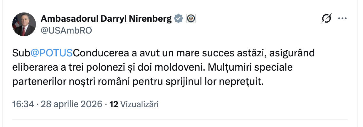 „Sub conducerea Președintelui Trump, astăzi s-a înregistrat un mare succes în asigurarea eliberării a trei polonezi și doi moldoveni. Mulțumiri speciale partenerilor noștri români pentru sprijinul lor neprețuit”, a scris ambasadorul SUA la București pe contul său de X.