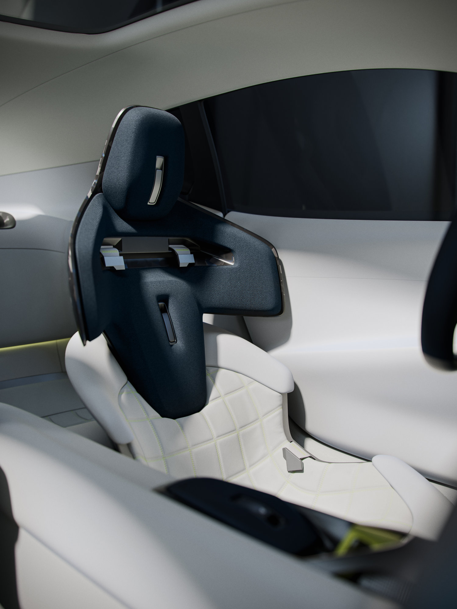 Pielea White Digital Shimmer creează o atmosferă luminoasă și rafinată, contrastată de detalii tehnice care subliniază scopul său sportiv. În spatele scaunelor, fibra de carbon Textreme® 360 montată manual strălucește ca lumina stelelor, combinând materiale avansate cu măiestria artizanală.