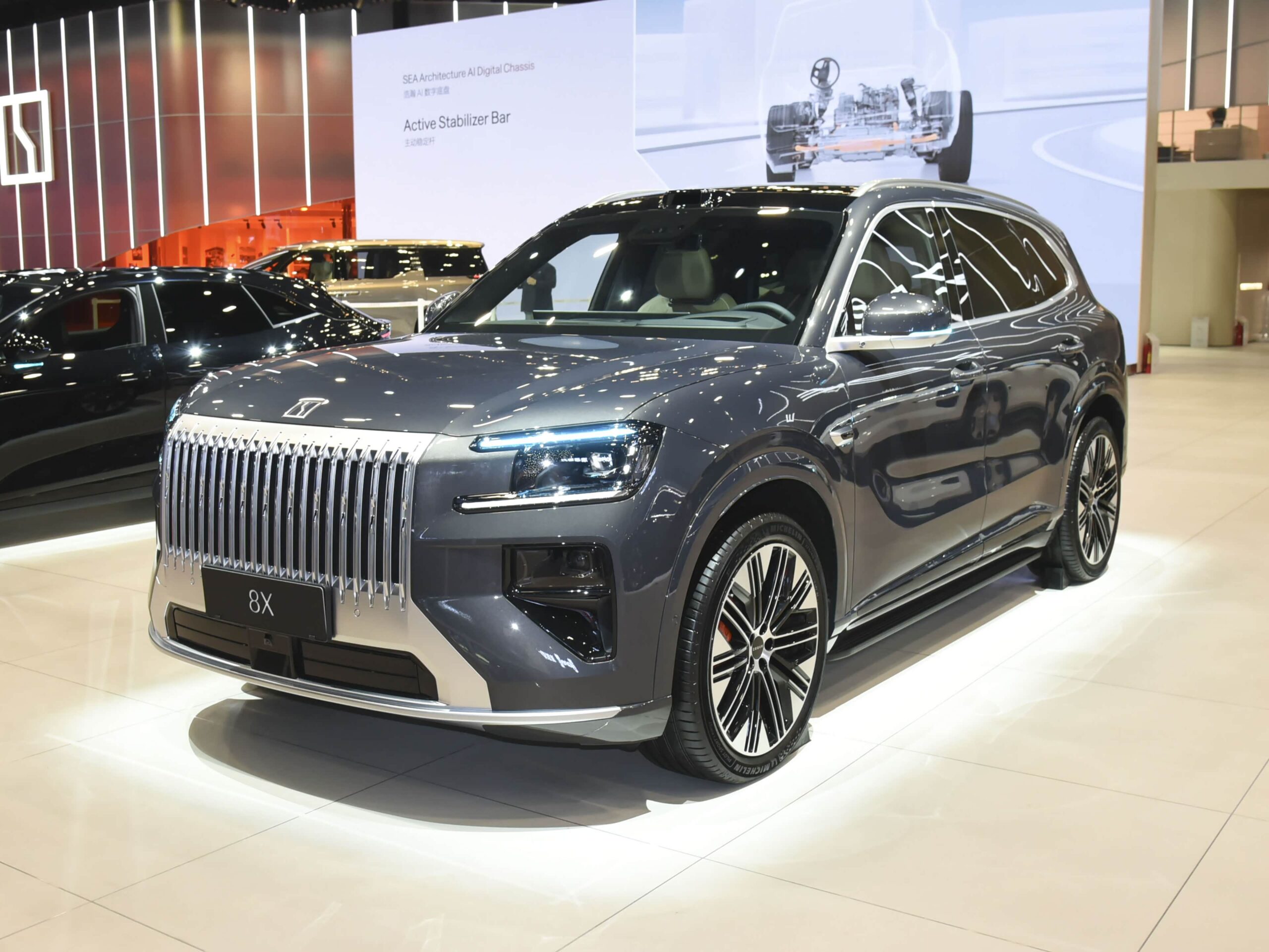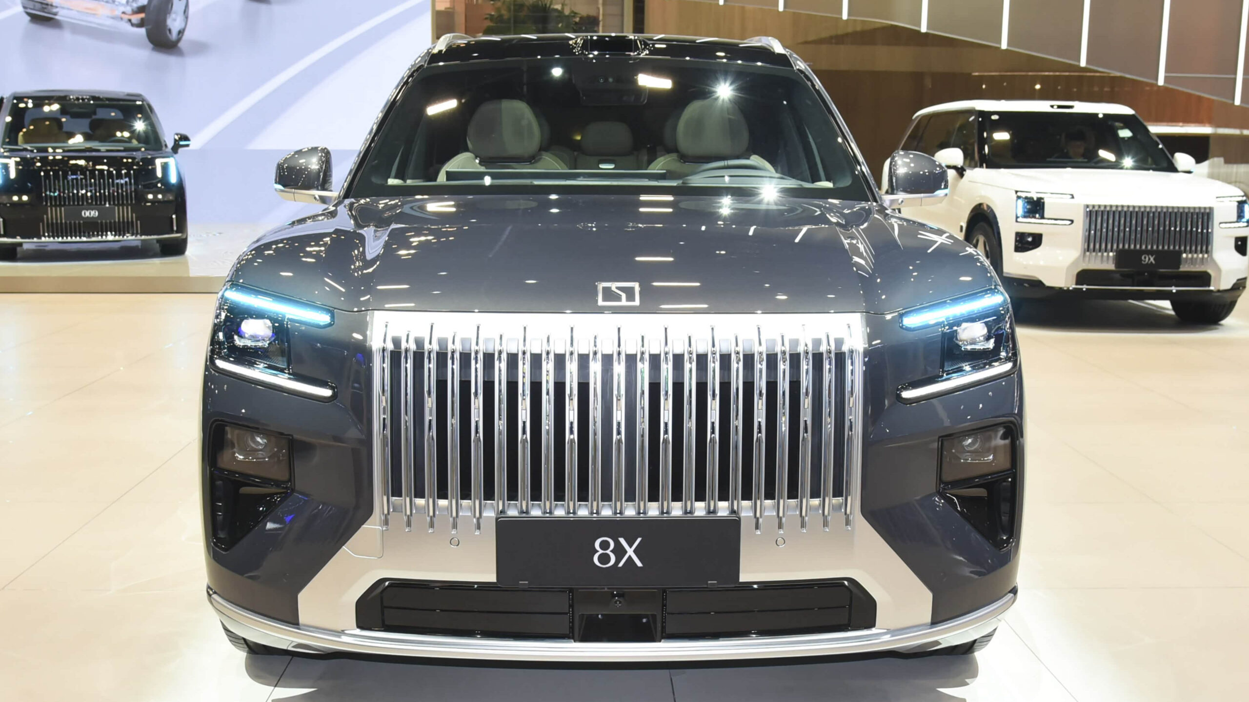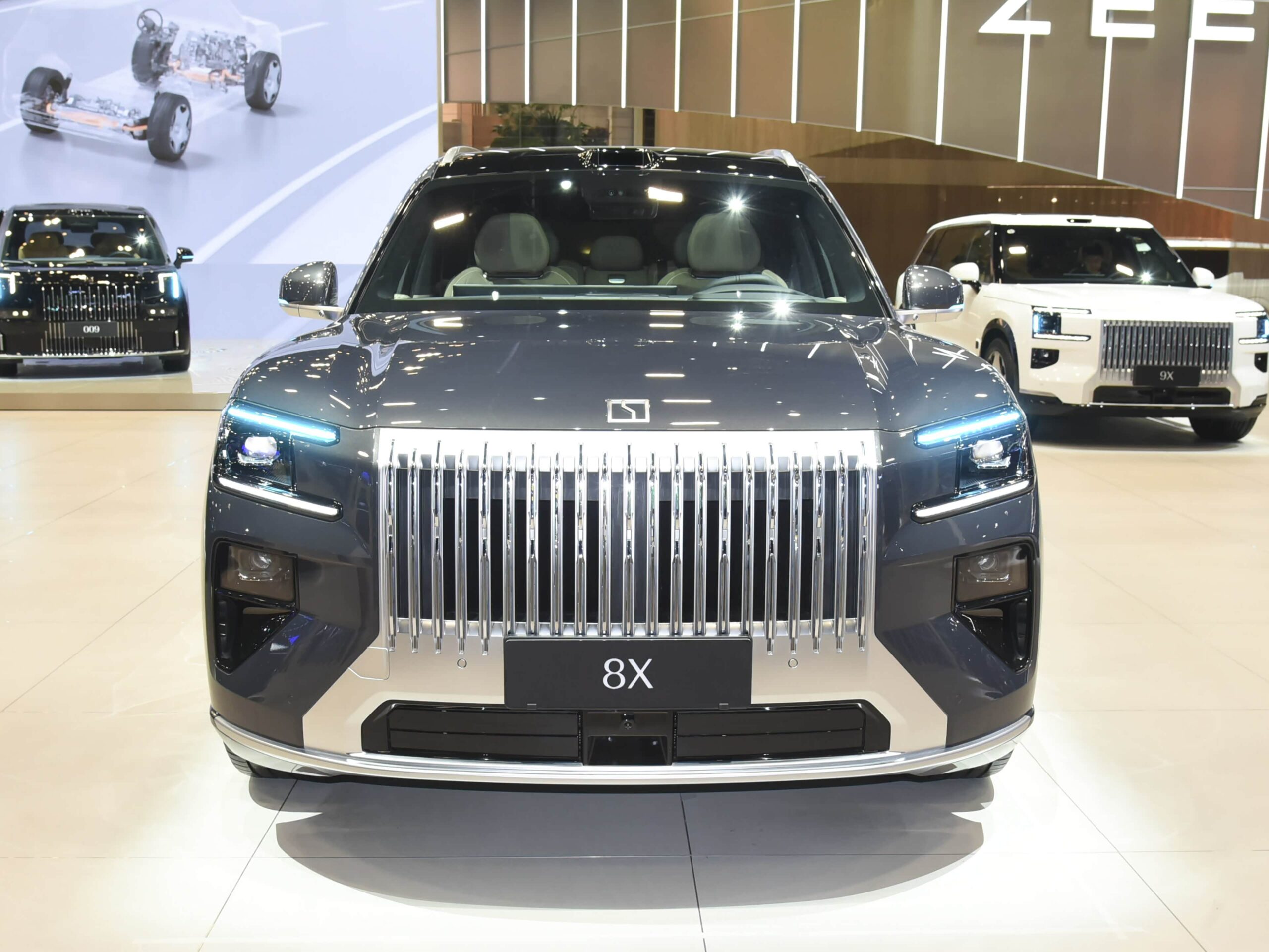 Grila frontală este largă, iar farurile sunt puțin mai mici decât pe Zeekr 9X. Constantin Mihalachi, care a făcut cunoștință cu toată gama de modele și a văzut noutatea inclusiv în faza de dezvoltare, consideră că 8X are forme foarte frumoase, bine conturate, fiind actualmente cu cel mai reușit design.