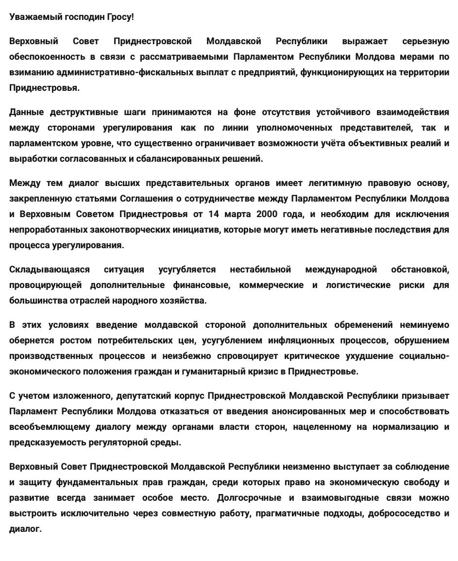 Pretinsul soviet suprem de la Tiraspol s-a adresat Parlamentului de la Chișinău și s-a plâns pe lipsă de dialog, Într-o scrisoare adresată lui Igor Grosu, oficialii separatiști își exprimă „îngrijorarea profundă”, referitoare la eliminarea facilităților fiscale pentru regiunea transnistreană.