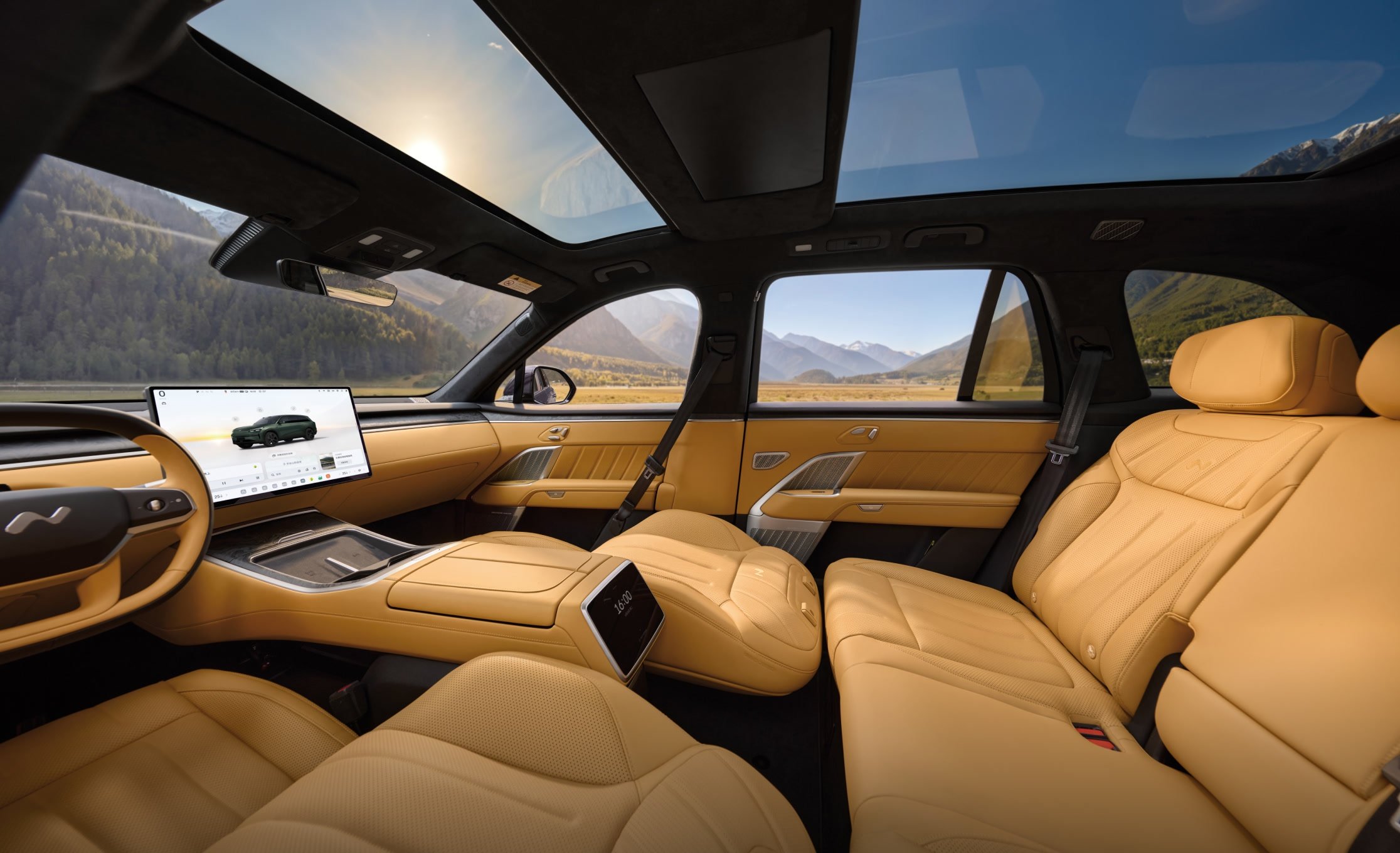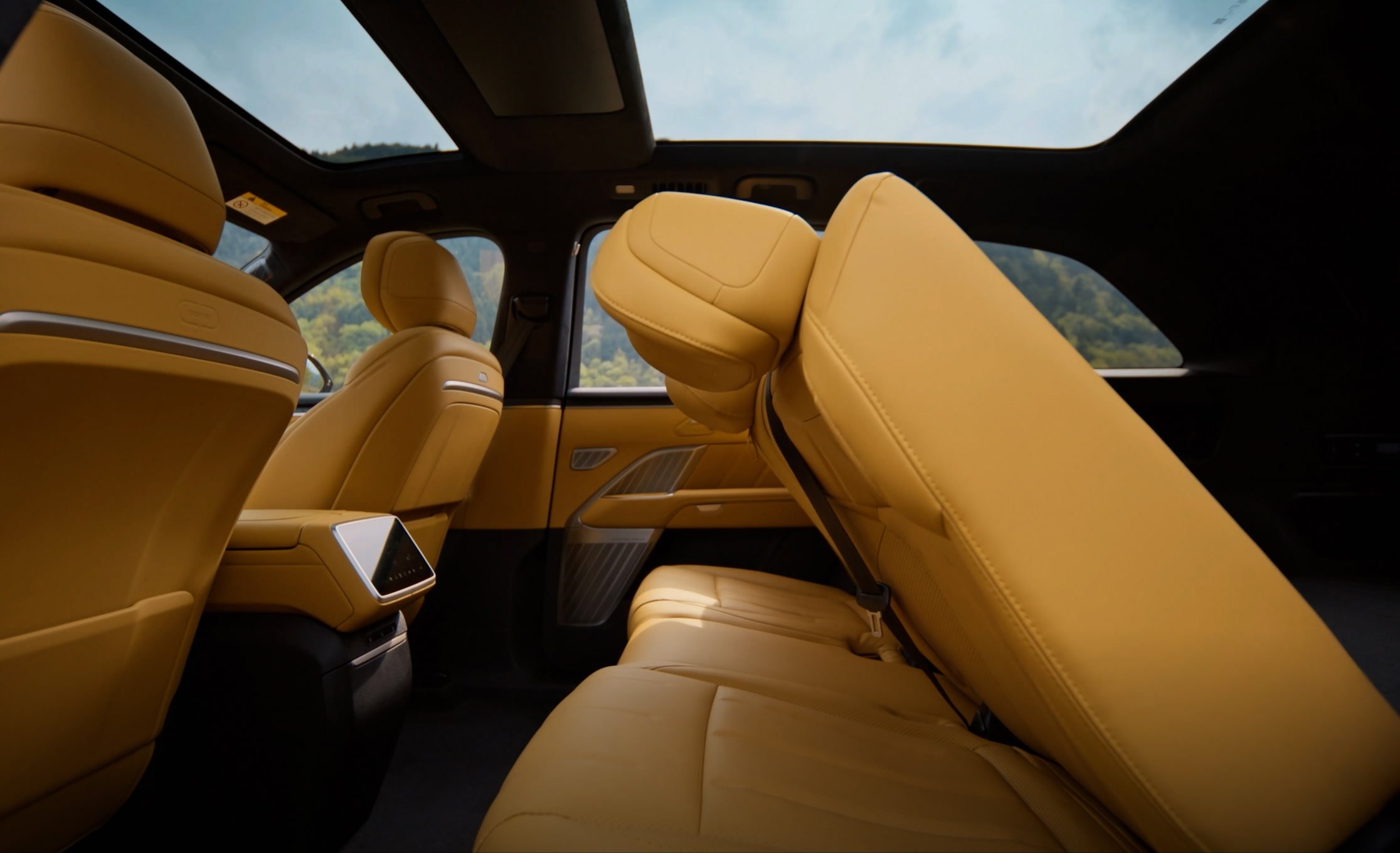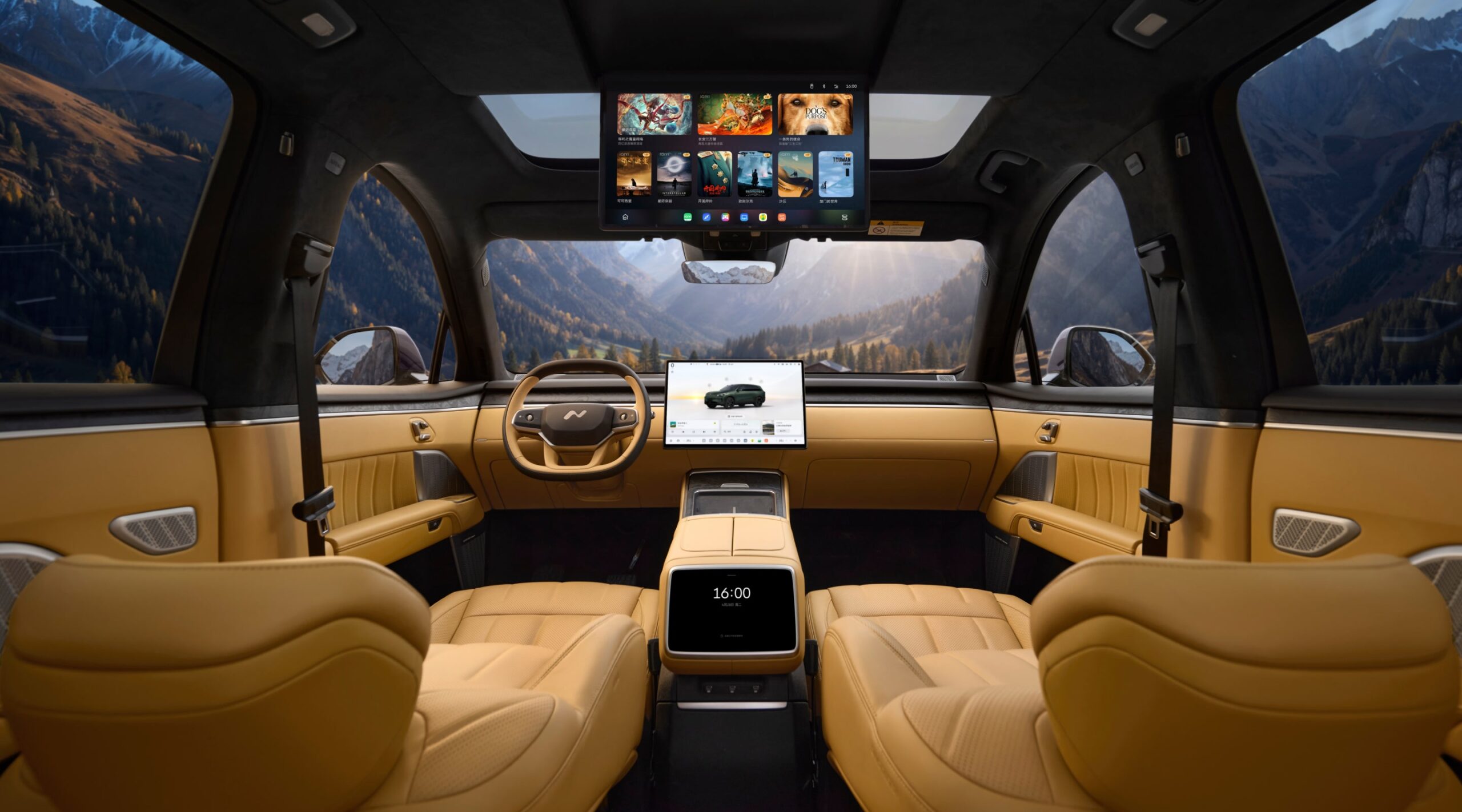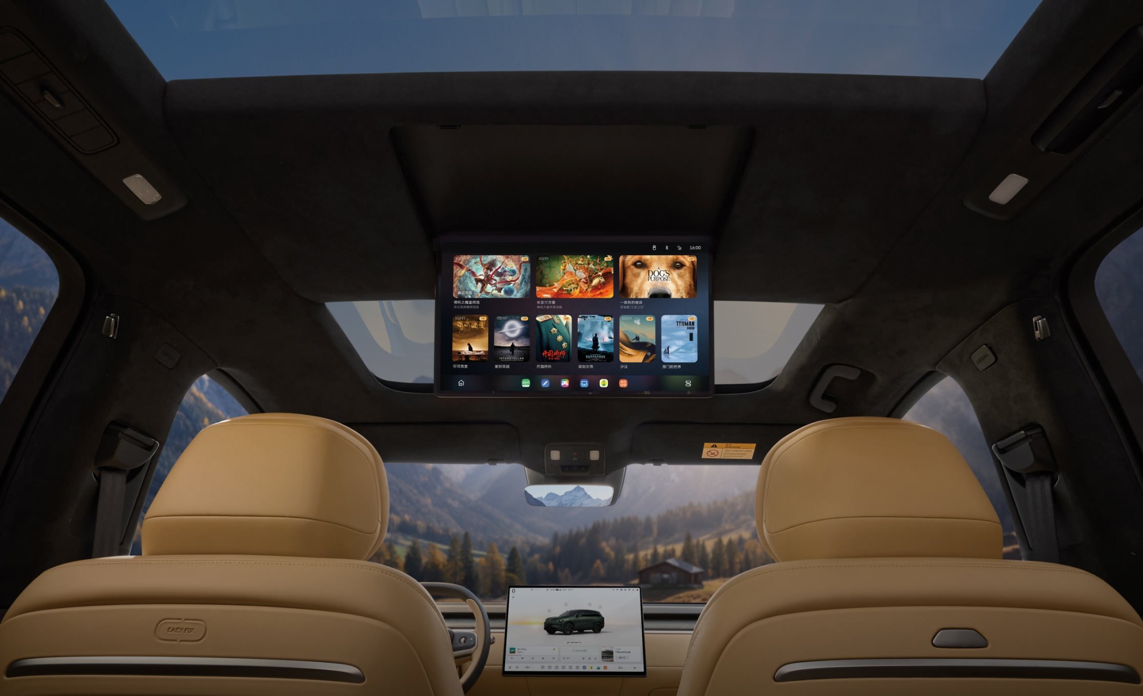 - Ecrane: patru (head-up display de 35 inchi cu AR, central de 17.2 inchi, în tavan de 17.3 inchi și unul de 8 inchi pentru controlul funcțiilor de către pasagerii din spate)