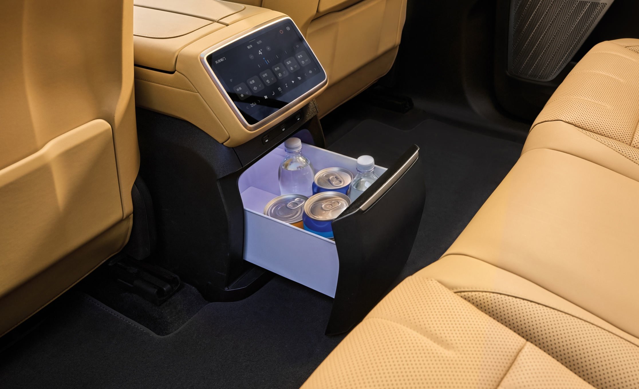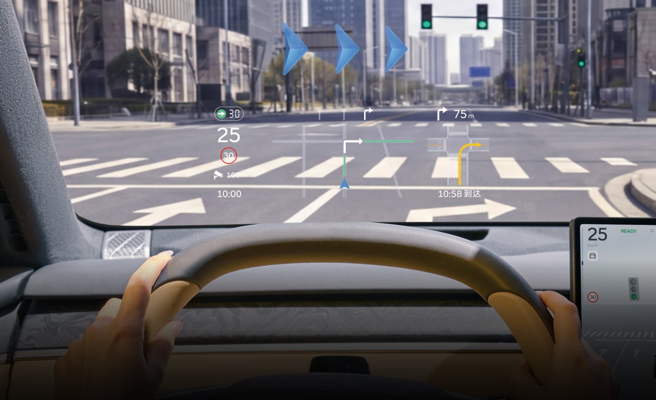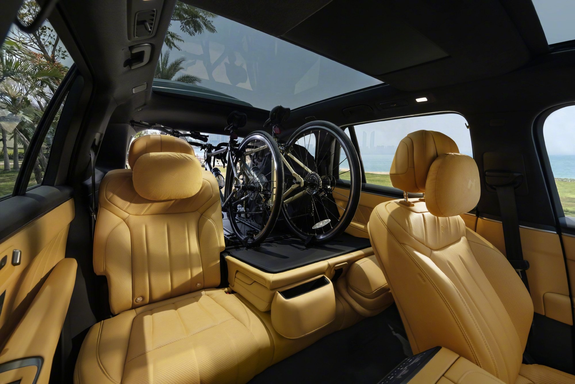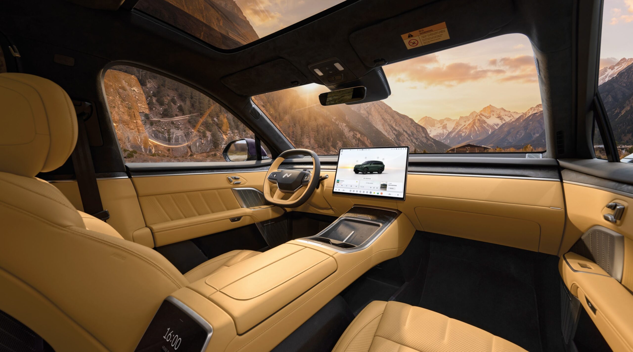 - Ecrane: patru (head-up display de 35 inchi cu AR, central de 17.2 inchi, în tavan de 17.3 inchi și unul de 8 inchi pentru controlul funcțiilor de către pasagerii din spate)